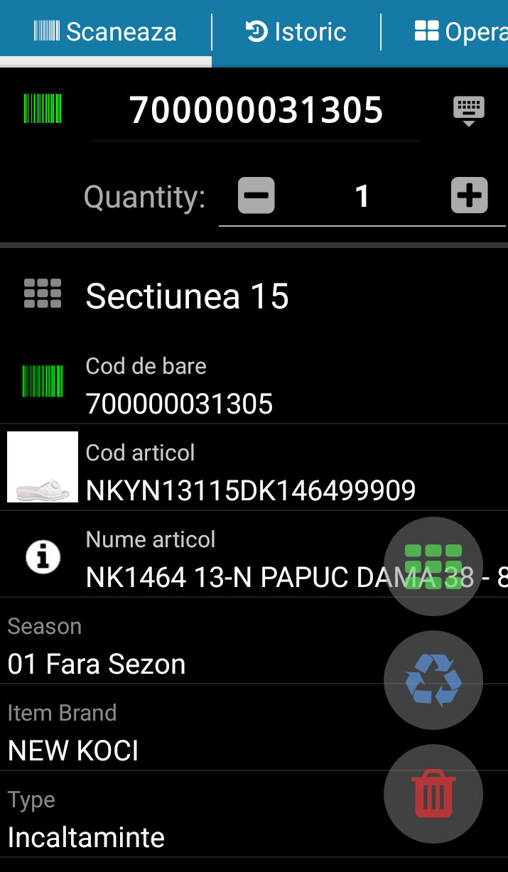 Cantitatea se modifica pentru codul scanat. Operarea este de forma: se scaneaza si se introduce cantitatea, apoi se trece la articolul urmator, se scaneaza, cantitatea revine la 1.