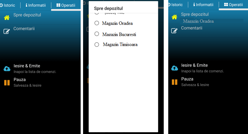 In fereastra Operatii se apasa tasta Spre depozitul si se selecteaza din lista gestiunea catre care se transfera marfa.