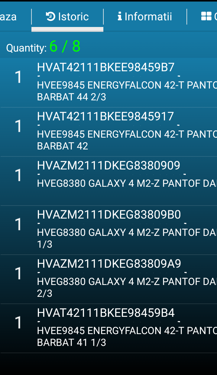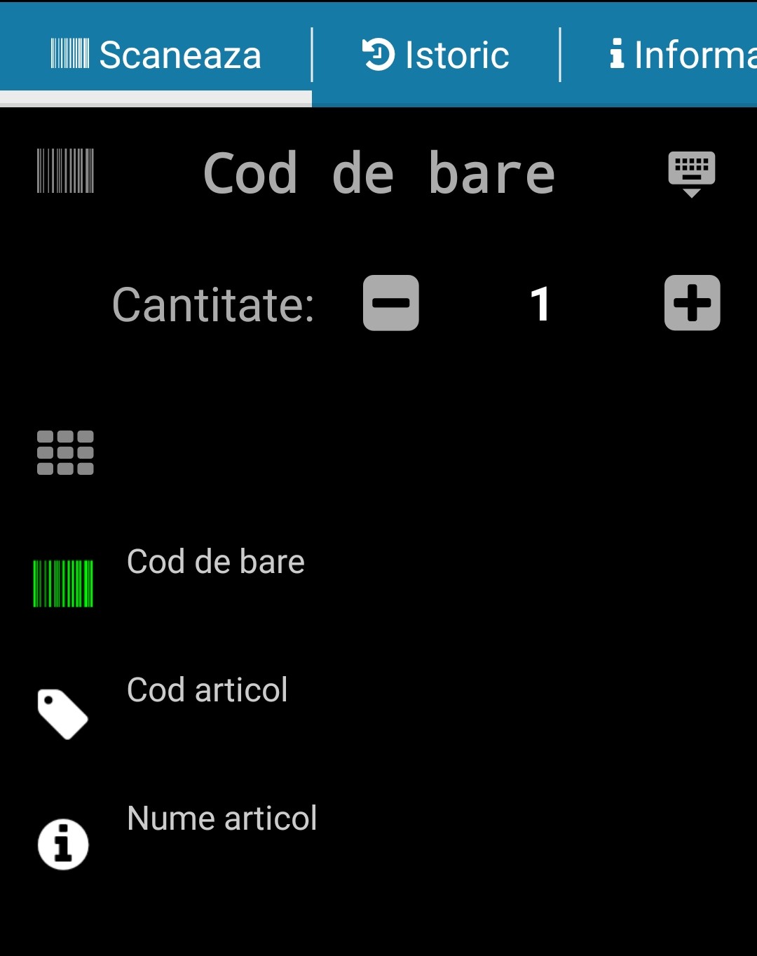 Cantitatea se modifica pentru codul scanat. Operarea este de forma: se scaneaza si se introduce cantitatea, apoi se trece la articolul urmator, se scaneaza, cantitatea revine la 1.Automat pentru o scanarea noua cantitatea este 1.Daca se scaneaza un cod de bare nerecunoscut sau articolul nu se afla in nomenclatorul de articole, se va auzi un semnal de eroare.